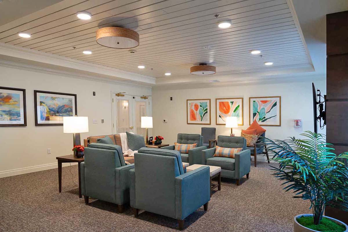 The shared common areas throughout the building were upgraded using finishes and colors chosen by Sunrise Redmond’s in-house design team, who oversee design decisions throughout the national chain.